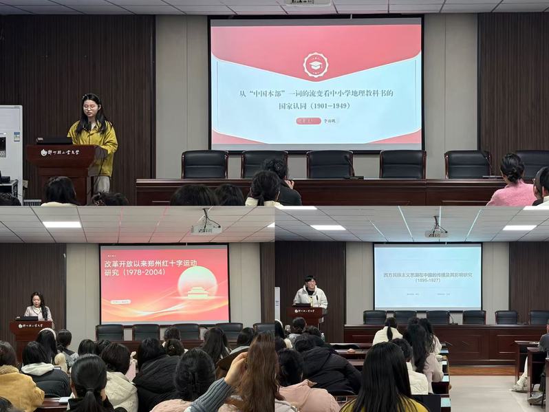 2024级研究生李雨矾、裴亚宁、种硕分别就各自的研究方向进行了论文选题汇报。李雨矾的《从“中国本部”一词的流变看中小学地理教科书的国家认同(1901-1949)》,探讨了地理教科书中的概念演变与国家认同建构的关系;裴亚宁的《改革开放以来郑州红十字运动研究(1978-2004)》,聚焦郑州地区红十字组织的发展历程与社会贡献;种硕的《西方民族主义思潮在中国的传播及其影响研究(1895-1927)》,则分析了该思潮传入中国后的影响。三位同学分别从选题意义、研究现状、论文框架及创新难点等方面进行了阐述。