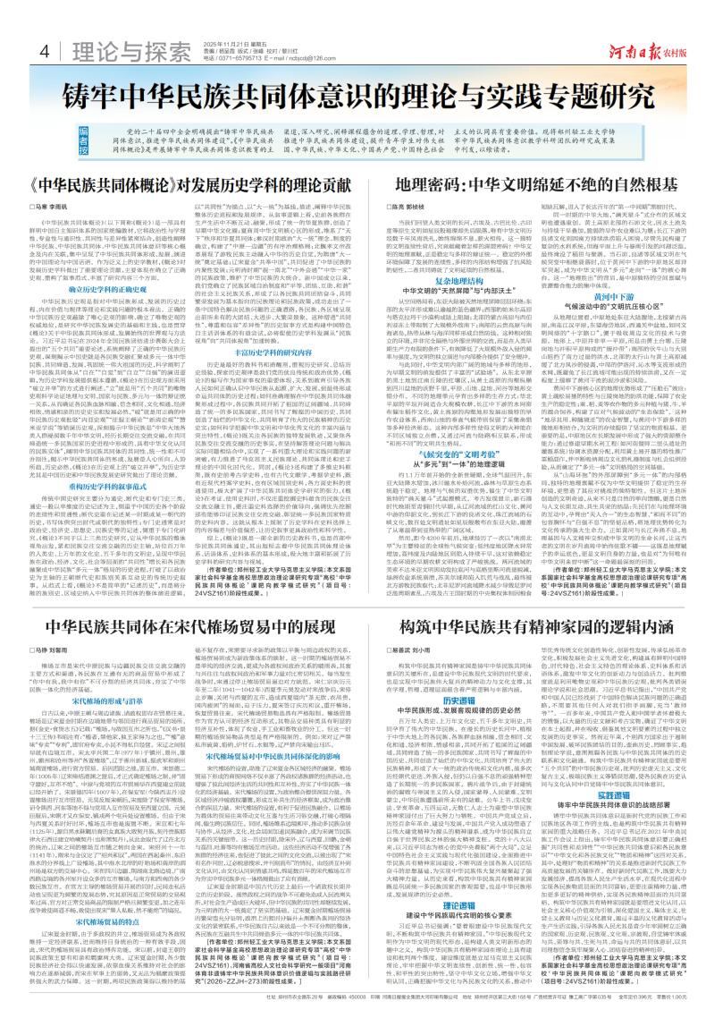 2025年11月21日,河南日报分别以《<中华民族共同体概论>对发展历史学科的理论贡献》《中华民族共同体在宋代榷场贸易中的展现》《地理密码:中华文明绵延不绝的自然根基》《构筑中华民族共有精神家园的逻辑内涵》为题,报道我校马克思主义学院教师文章。