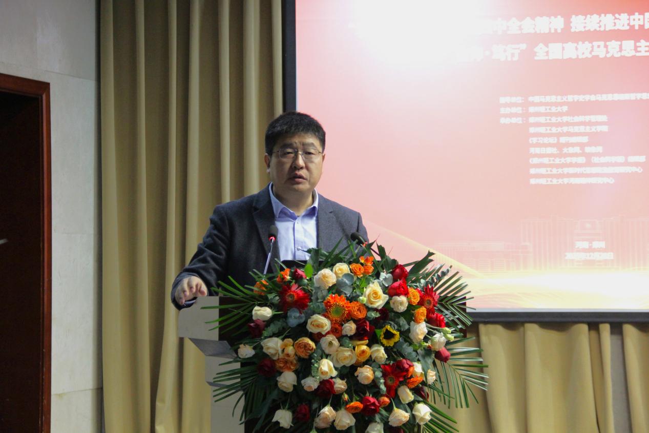 杨新宇代表郑州轻工业大学向与会的专家学者、青年学子表示热烈欢迎。他介绍了学校的发展历程、办学特色以及马克思主义理论学科的基本情况。他指出,党的二十届四中全会站在新的历史起点,对推进中国式现代化作出了战略部署,擘画了宏伟蓝图。这既为哲学社会科学的繁荣发展注入了强大动力、开辟了广阔空间,也对理论创新和学术研究提出了新的更高要求。他强调,深刻阐释中国式现代化的理论逻辑、历史逻辑与实践逻辑,科学回答前进道路上的一系列重大课题,是哲学社会科学工作者,特别是广大马克思主义理论研究者与青年学子的时代责任与学术担当。本次研讨会紧扣时代脉搏、立足中国实际,聚焦理论前沿与实践热点,为深化中国式现代化理论研究、推动马克思主义理论学科创新发展搭建了高水平交流平台。他希望,与会专家、青年学子围绕主题深入研讨,产出具有深刻洞察力、理论说服力和实践指引力的成果,以实际行动回应“时代之问”,成就立足中国、观照世界的“中国学问”